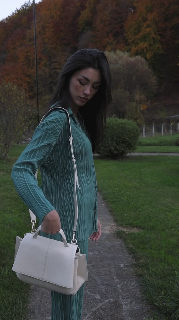 Elegantna tašna sa podesivim dugim pojasom i otvaranjem na bravicu za dodatnu sigurnost. Unutra ima dva razdeljka, pri čemu jedan sadrži džep na rajsferšlus, a drugi pregradicu. Praktična i sofisticirana, idealna za organizaciju i svakodnevnu upotrebu.